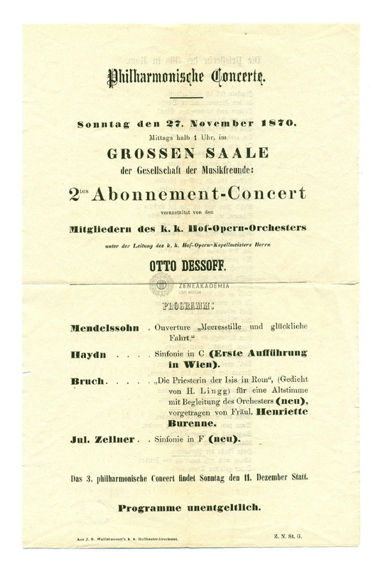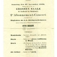 Műsor: Mendelssohn, Haydn, Bruch és Zellner művei. (Közreműködnek a K.K. Hof-Opern-Kapelle tagjai, vez. Otto Dessoff). A hátoldalon a Bruch-mű szövege gót betűkkel.