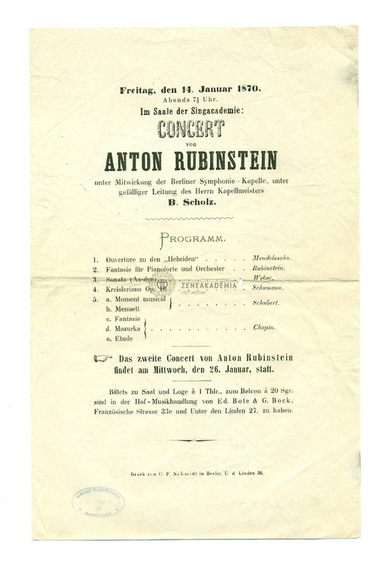 Műsor: Mendelssohn, Rubinstein, Weber, Schumann, Schubert és Chopin művei. (km. A Berlini Szimfónikus Zenekar, vez. B. Scholz).