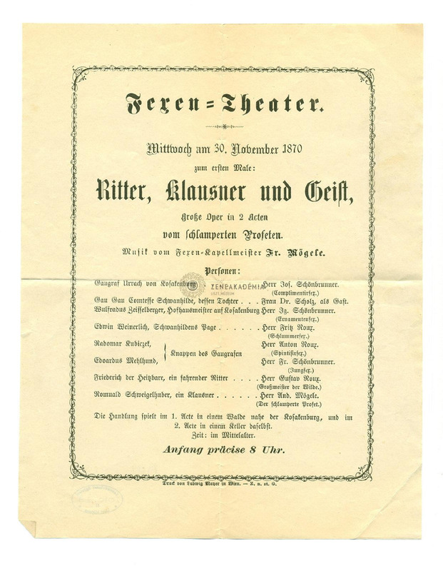 Ritter, Klausner und Geist (Lovag, remete és lélek) Vögele: Der schlamperte Profet (Az ápolatlan próféta) című operájának 2-dik felvonásából. Az előadáók felsorolása.