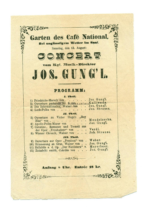 Műsor: Gungl, Kalliwoda, Strauss, Mendelssohn, Verdi és Meyerbeer művei (vez. Gungl?).