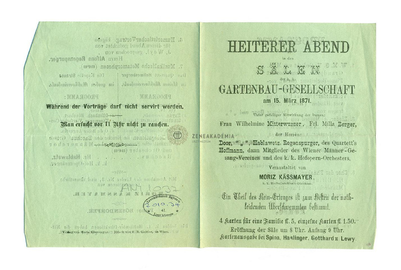Műsor: Meyerbeer, Beethoven, Haydn, Schubert, Bach, Strauss, Offenbach és Kassmayer művei. (km. W. Mitterwurzer, M. Berger, H. Regenspurger, Quartett’s Hoffmann, Wiener Manner- Gesang- Verein és a K.K. Hofopern-Orchester. Rendező: Moriz Kassmayer).