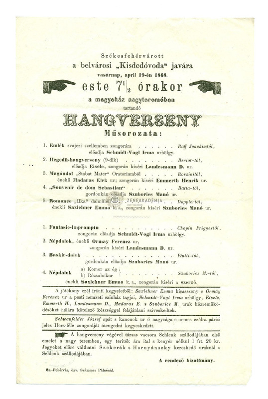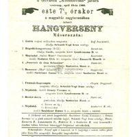 Műsor: Joachim, Beriot, Rossini, Batta, Doppler, Chopin, Piatti és Szubovics M. művei. (km. Saxlehner Emma, Ormay Ferenc, Schmidt-Vogl Irma, Eisele, Emmerth Henrik, Landessmann D., Madaras Elek, Szubovics Manó)