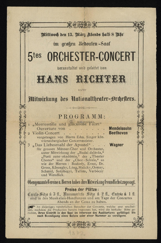 Műsor: Mendelssohn, Beethoven és Wagner művei. (km. A Nemzeti Szinház zenekara).