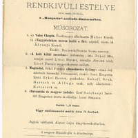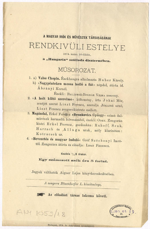 - Műsor: Huber Károly, Ábrányi Kornél, Erkel Ferenc átiratai ill. Liszt: A holt költő szerelme (melodráma), Bevezetés és magyar induló c. művei. (km. Balázsné- Bognár Vilma, Jókainé, Odry, Erkel Ferencz, Ruhoff, Szuk Harrach, Allaga és Kotracsek valamint Liszt).