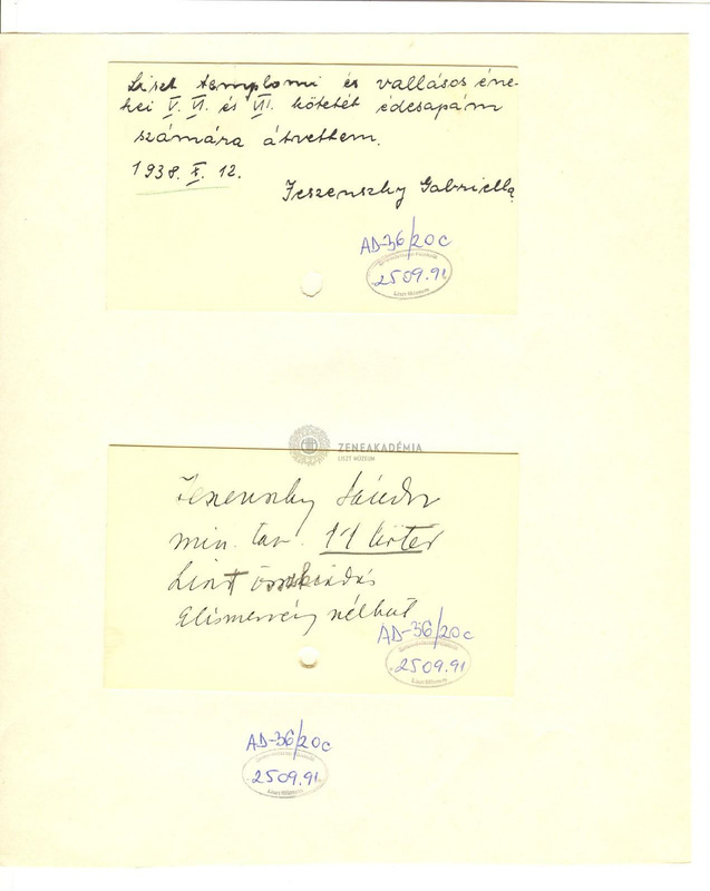 Jeszenszky Gabriella feljegyzése arról, hogy édesapja, Jeszenszky Sándor számára átvette a Liszt-összkiadás "Templomi és vallásos énekművek" 5., 6. és 7. kötetét és Jeszenszky Sándor feljegyzése a Liszt kiadás 11 kötetének átvételéről elismervény nélkül.