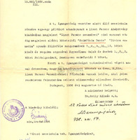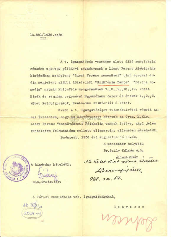 Dr. Szily Kálmán államtitkár levele a debreceni városi zeneiskola igazgatóságának arról, hogy a miniszteri rendelet alapján a Liszt Ferenc Alalpítvány által kiadott "Liszt Ferenc zeneművei" sorozat mely köteteit vehetik át a Zeneművészeti Főiskolán.Továbbá feljegyzés arról, hogy Dr. Baranyi János a megnevezett 12 kötetet 1938.11. 17-én átvette.