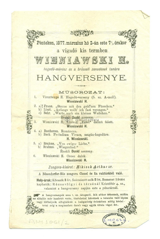 Műsor: Wieuxtemps, Franz, Liszt, Behr, Beethoven, Bach és Brahms művei. Km. Nikisch Arthur.