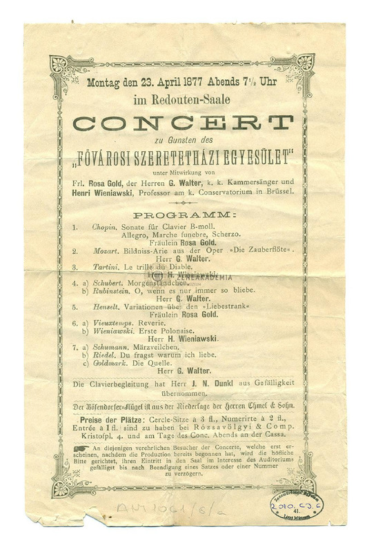 Műsor: Chopin, Mozart, Tartini, Schubert, Rubinstein, Henselt, Wieuxtemps, Wieniawsky, Schumann, Riedel és Goldmark művei. Km. Gold Róza, Walter G. (ének) és H. Wieniawsky.