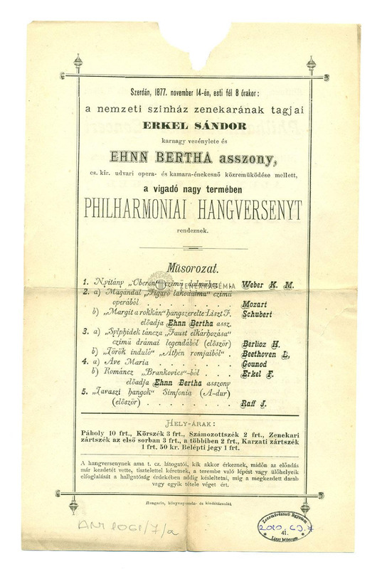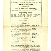 Műsor: Weber, Mozart, Schubert, Berlioz, Beethoven, Gounod, Erkel és Raff művei. Km. a Nemzeti Szinház zenekarának tagjai ill. Ehnn Bertha (kamaraénekesnő). Vez. Erkel Sándor