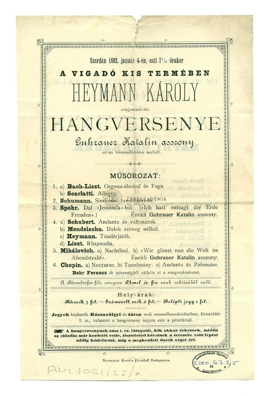Műsor: Bach, Scarlatti, Schumann, Spohr, Schubert, Mendelssohn, Heymann, Mihalovich és Chopin művek, valamint Liszt Rhapsodiája (?).