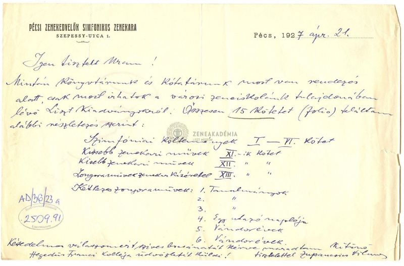 Zupancsics Vilmos értesítőlevele a Pécsi Zenekedvelők Szimfonikus Zenekarától arról, hogy könyvtárukban és kottatárukban a Liszt-összkiadás 15 kötete található meg, s ezek részletes felsorolása.