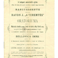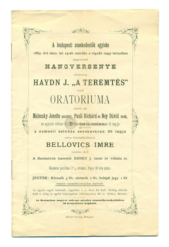 Műsor: Haydn: Teremtés. Km. Az egyleti nőikar, férfikar és zenekar tagjai, a Nemzeti Színház zenekarának tagjai, Maleczky Jozefin, Pauli Richard és Ney Dávid. Vez. Bellovics Imre. Melléklet: A mű szövegkönyve magyarul (Dr. Váradi Antal fordításában).