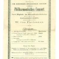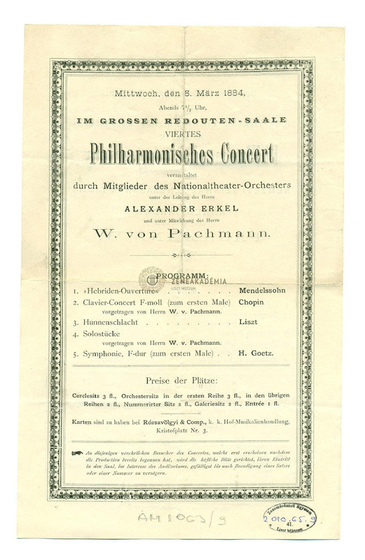 Műsor: Mendelssohn, Chopin, és Goetz H. művei, valamint Liszt: Hunok csatája. Km. a Nemzeti Szinház zenekarának tagjai, Pachmann W. (zongora). Vez. Erkel Sándor.