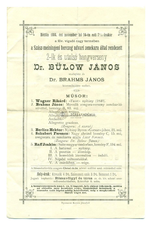 Műsor: Wagner, Brahms, Berlioz, Schubert és Raff műve. Km. Brahms. Vez.: Hans von Bülow.