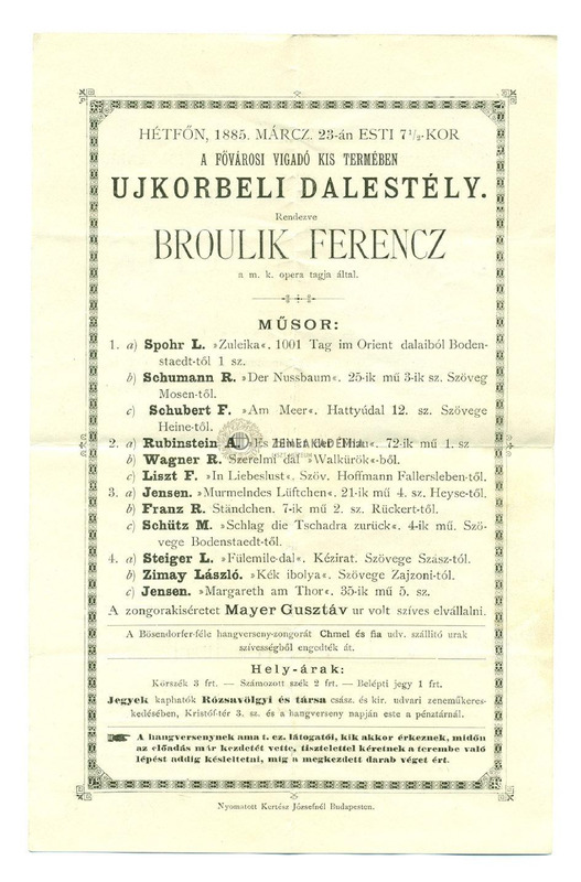 Műsor: Spohr, Schumann, Schubert, Rubinstein, Wagner, Jensen, Franz, Schütz, Steiger és Zimay művei, valamint Liszt: „In Liebeslust”.