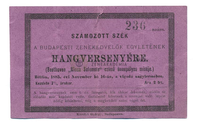 - Belépő a Budapesti Zenekedvelők Egyletének Hangversenyére.
