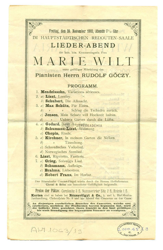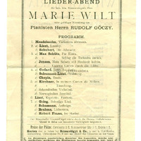 Műsor: Mendelssohn, Schubert, Schütz, Jensen, Godard, Schumann, Chopin, Kirchner, Grieg, Brahms és Robert Franz művei, ill. Liszt: Loreley, Widmung és Rigoletto ábrándja.