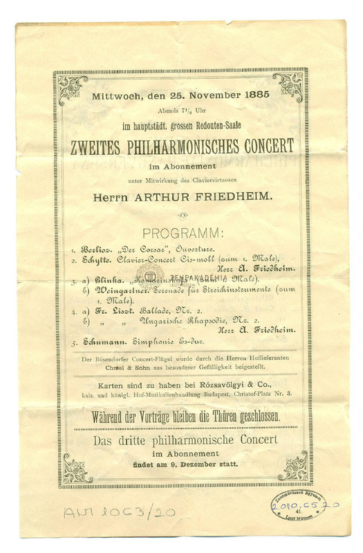 Műsor: Berlioz, Schytte, Glinka, Weingartner és Schumann művek, valamint Liszt: Ballada és II. Magyar Rapszódia. Km. Friedheim Arthur (zongora).